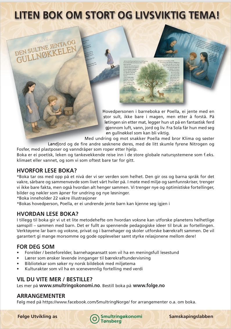 Hovedpersonen i barneboka Den sultne jenta og gullnøkkelen heter Poella. Hun er ei jente med en stor sult, ikke bare i magen, men etter å forstå. På letingen sin etter mat, legger hun ut på en fantastisk ferd gjennom luft, vann, jord og liv. Fra Sola får hun med seg en gullnøkkel som kan bli viktig. Med undring og mot snakker Poella med bror Klima og søster Landjord og de fire andre søsknene deres, med de litt skumle fyrene Nitrogen og Fosfor, med plastposer og vanndråper som roper etter hjelp.